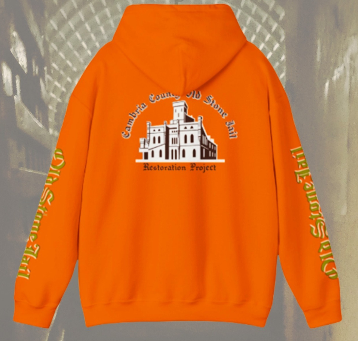 This cozy hooded sweatshirt features the Cambria County Old Stone Jail and is available for purchase in support of the Restoration Project. 100% of the proceeds will be used to preserve the history it holds and rebuild it with purpose for future generations. By purchasing, you help preserve a piece of local history that has stood since 1872, ensuring its stories live on for years to come.